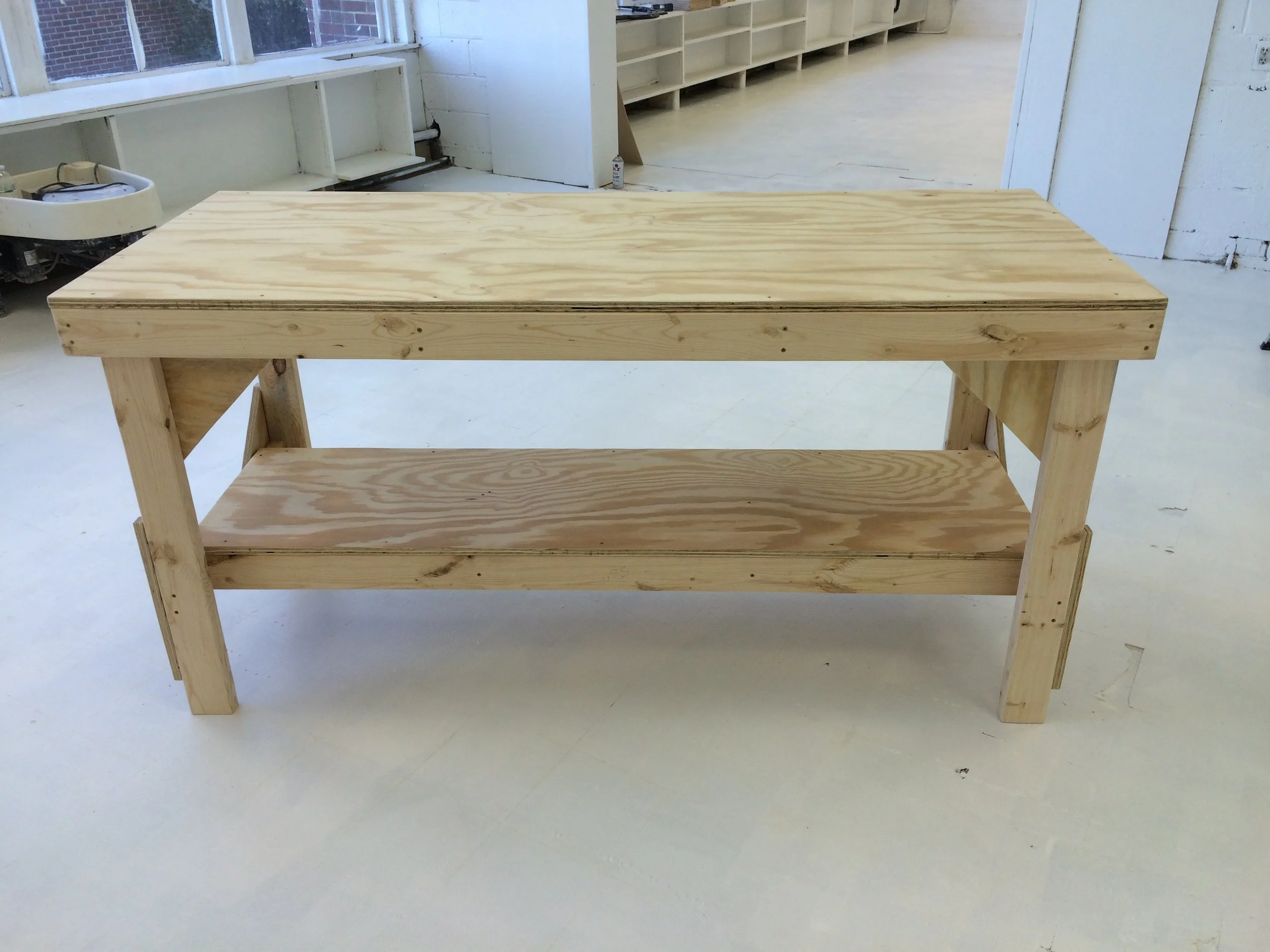 A sturdy "no truck" table design for hand building or any other work. It's designed so that you can get the lumber and the nearly-complete workbench in a full-sized sedan. It's 6' long, 2.5' wide, and 36 inches tall.